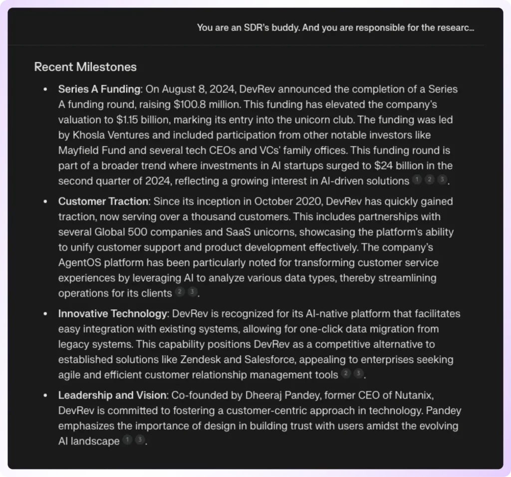 Prompt: "You are an SDR’s buddy. And you are responsible for the research and analysis of any given company or domain.
