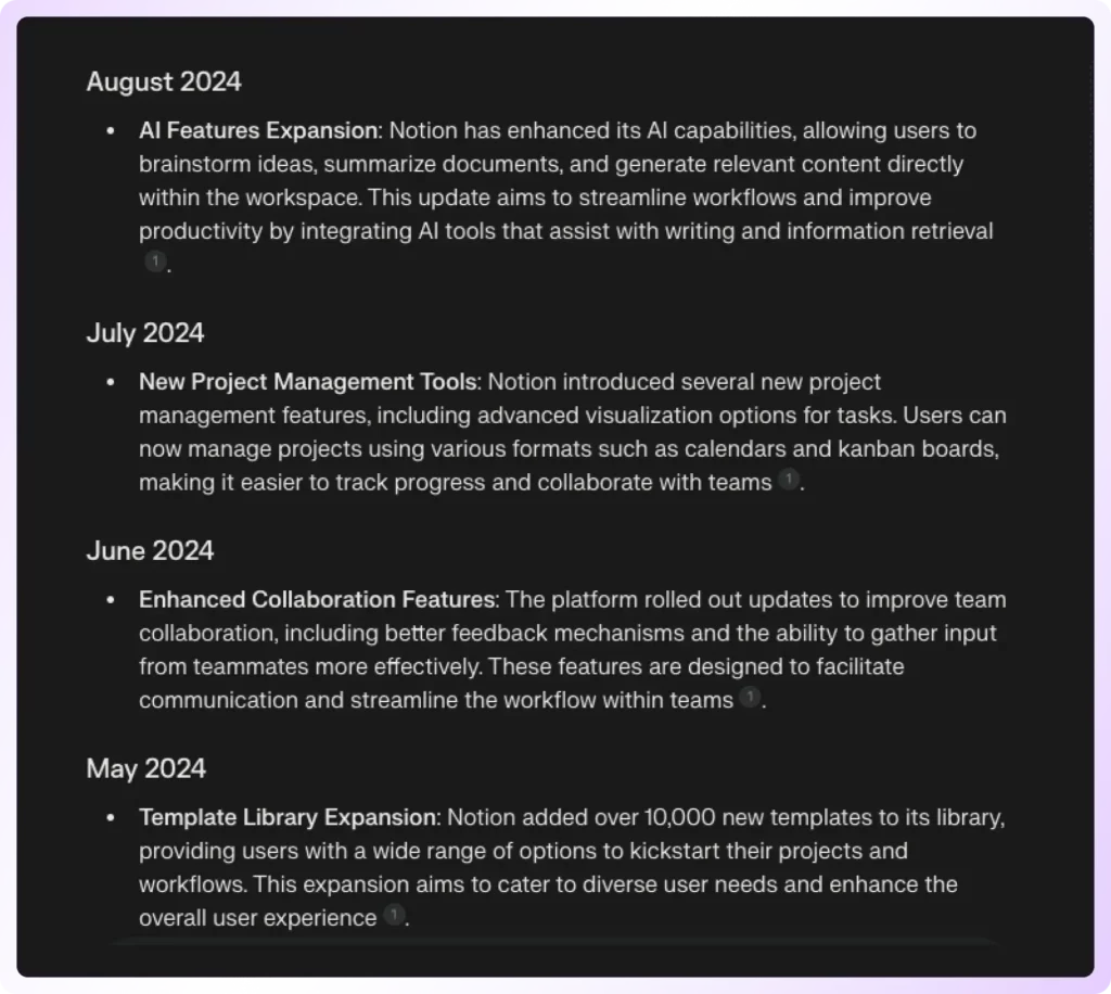 Whereas generative AI tools can do this process for you. You can use AI-driven prompts to quickly find out the latest product updates and feature launches.