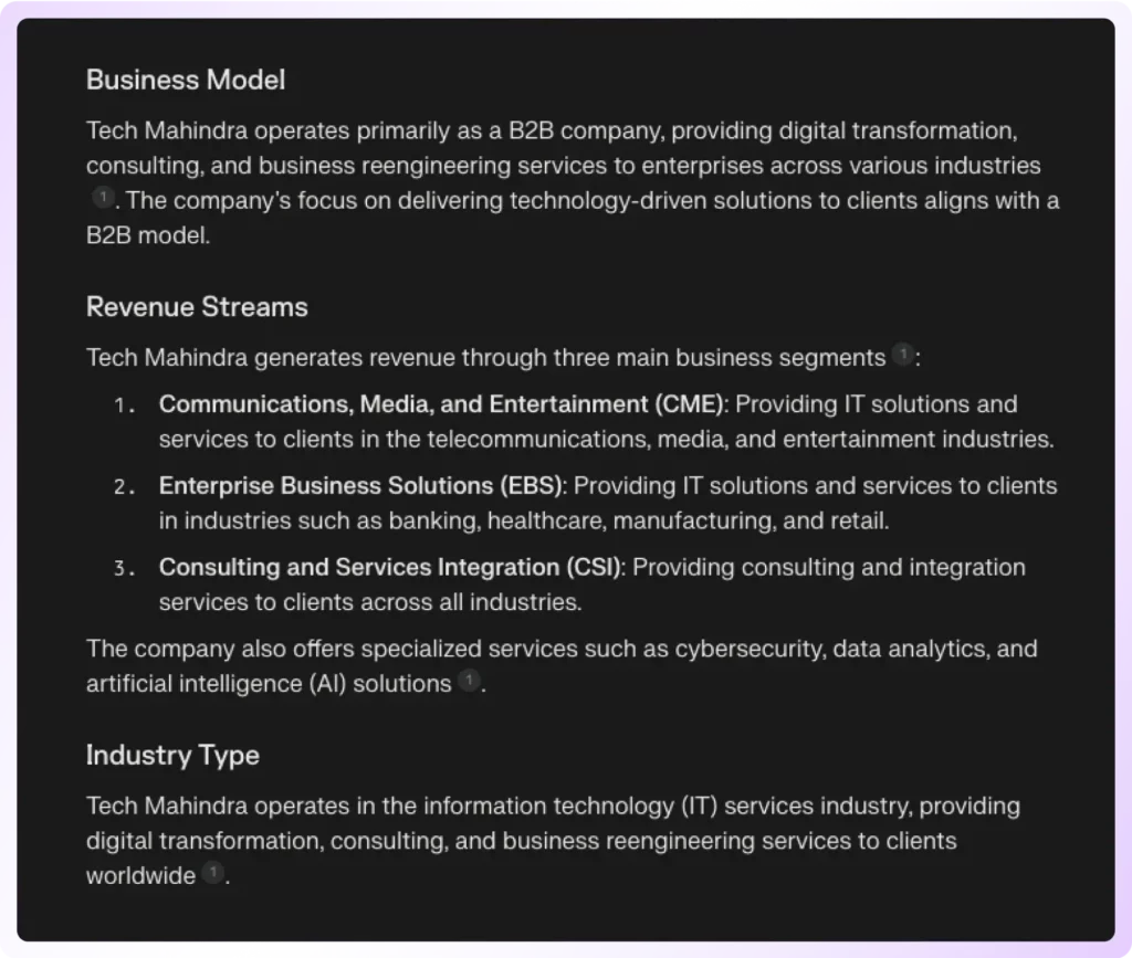 AI-driven prompts can quickly analyze vast amounts of data, including industry reports & company websites to give you a clear understanding of the prospect company’s business model.